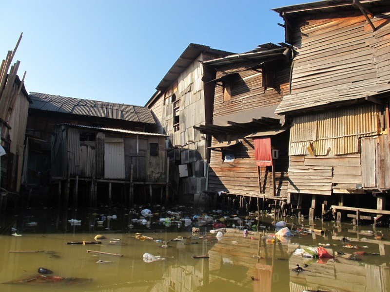 Pemandangan kontras antara gedung pencakar langit dan rumah terapung (Afif/detikTravel)